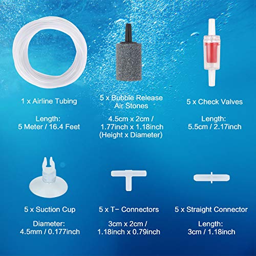 Set completo di accessori per acquario – Il nostro set include 1 pezzo di tubo standard per linee aeree da 5 metri / 16,4 piedi, 5 pezzi di pietra porosa a rilascio di bolle, 5 pezzi di valvola di ritegno, 5 pezzi di clip a ventosa, 5 pezzi di connettori diritti e 5 pezzi di connettori a T.